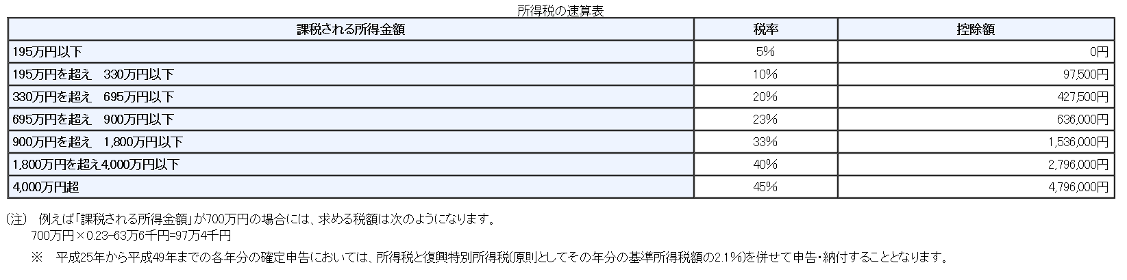 ということで、総合課税の場合は、以下が所得税の適用税率となります。(このほかに住民税があります。)