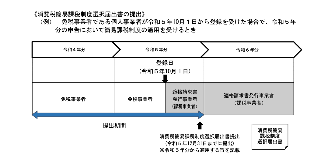 適格請求書発行事業者の登録申請書と同様にこちらも提出期限があります。もし、令和5年10月1日より適格請求書発行事業者となり簡易課税を選択するには、令和5年分から適用する旨を記載のうえ令和5年12月31日までに提出する必要があります。