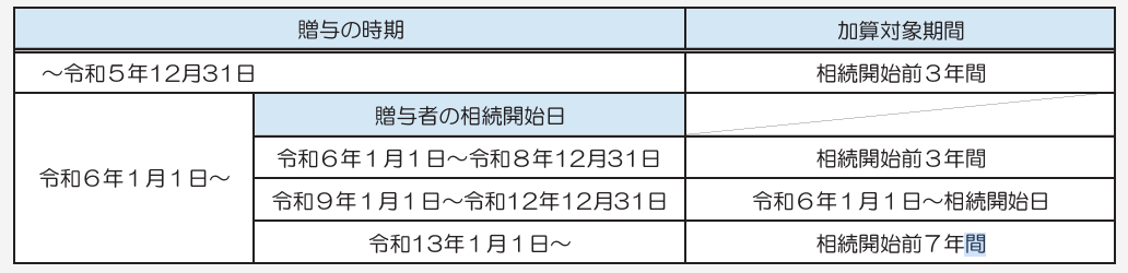 なお、この改正は、令和6年1月1日以後に贈与により取得する財産に係る相続税について適用されます。
